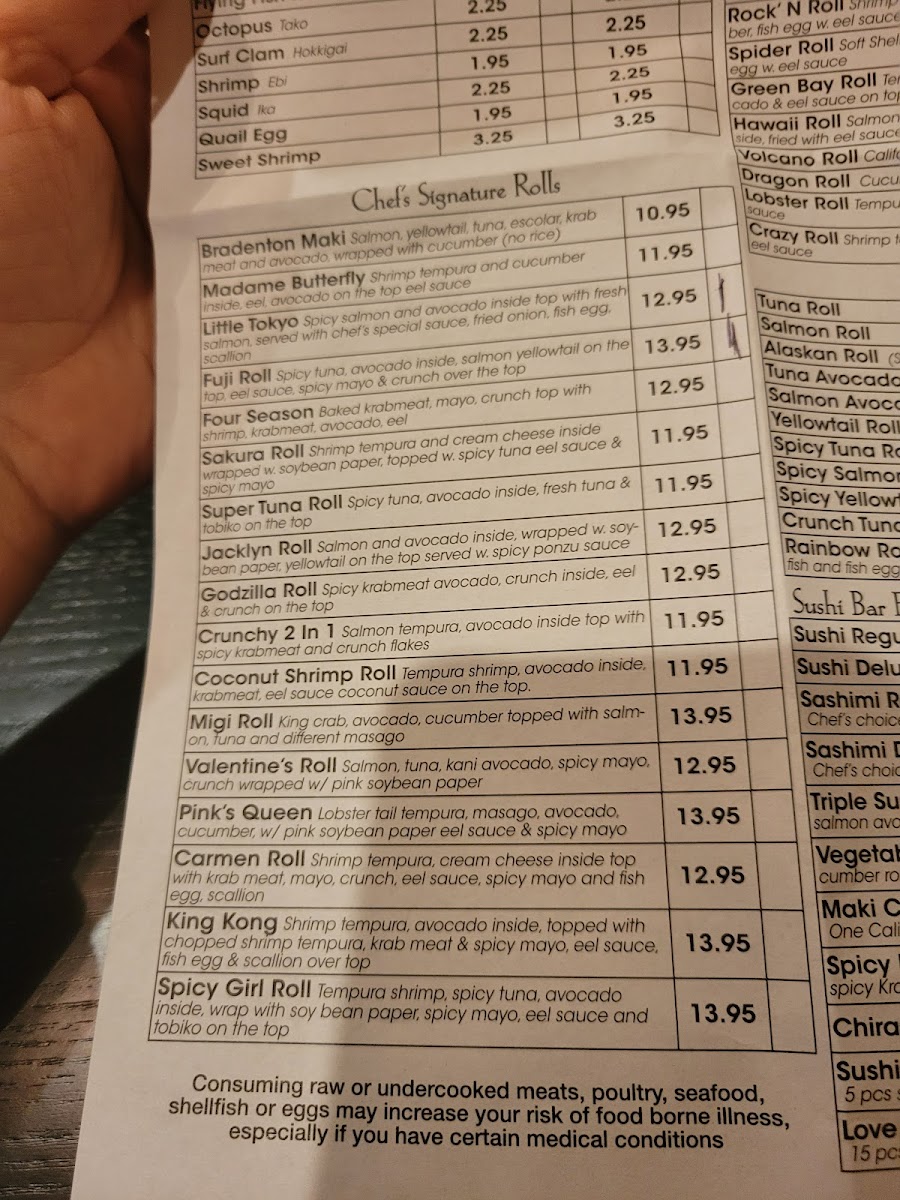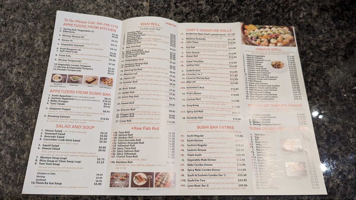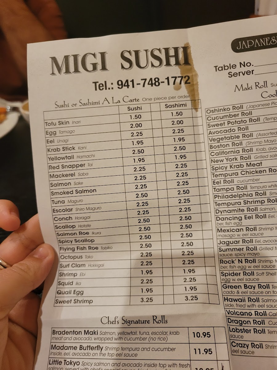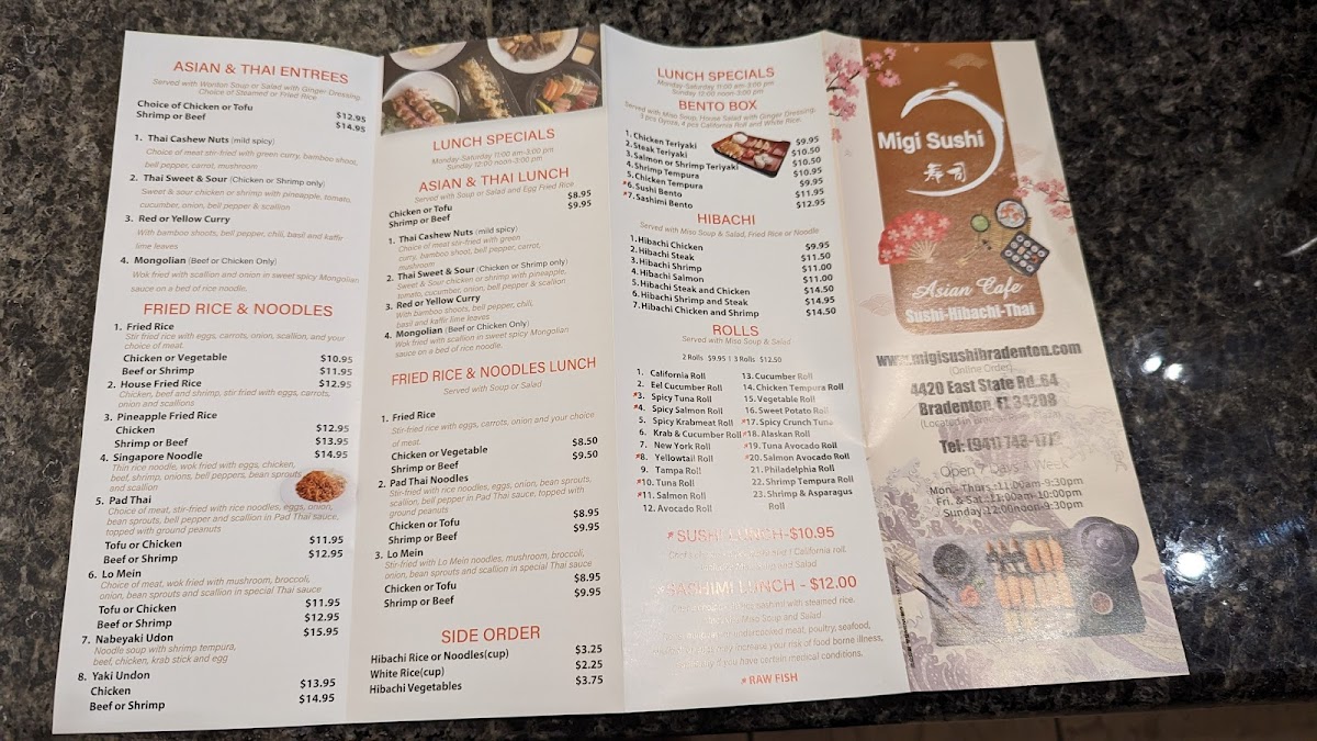 At Migi Sushi Restaurant Menu, you’ll discover a blend of traditional and innovative Japanese flavors that’ll make every meal memorable. Located in Bradenton, FL, the restaurant offers an extensive selection of freshly prepared sushi, sashimi, and specialty rolls, each crafted with top-quality ingredients. Whether you're a fan of classic tuna rolls or looking to try something unique, there’s something for everyone. Alongside the sushi, the menu features a range of appetizers, hearty entrées, and delicious sides that complement every dish. The atmosphere is casual and welcoming, perfect for both quick lunches and relaxed dinners. It’s not just about the food - it’s about the experience, making each bite feel like a special occasion.